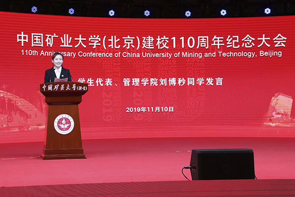 学校学生代表刘博秒在发言中表示,广大学子在思想锤炼中提升政治素养,在学习中勇攀知识高峰,在社会实践中认识国情,在志愿服务中展现自我。中国矿大(北京)厚重的历史文化积淀,已融入每一位学子的血脉。她表示将继承矿大精神,努力成为担当民族复兴大任的时代新人。